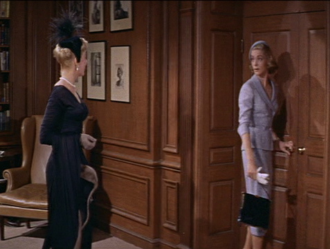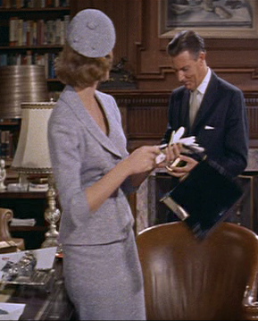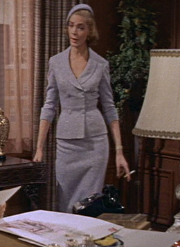 Note the definition of the waist and the slimline of the skirt. Don’t even get me started on the PERFECT angle of her cute little hat. Mmmm. The fabric covered buttons and the white gloves too! And the black hat on her imagined love rival is fantastic. Sigh. I love it. You know, if Mad Men is filled with images like this, I get why everyone raves about it.