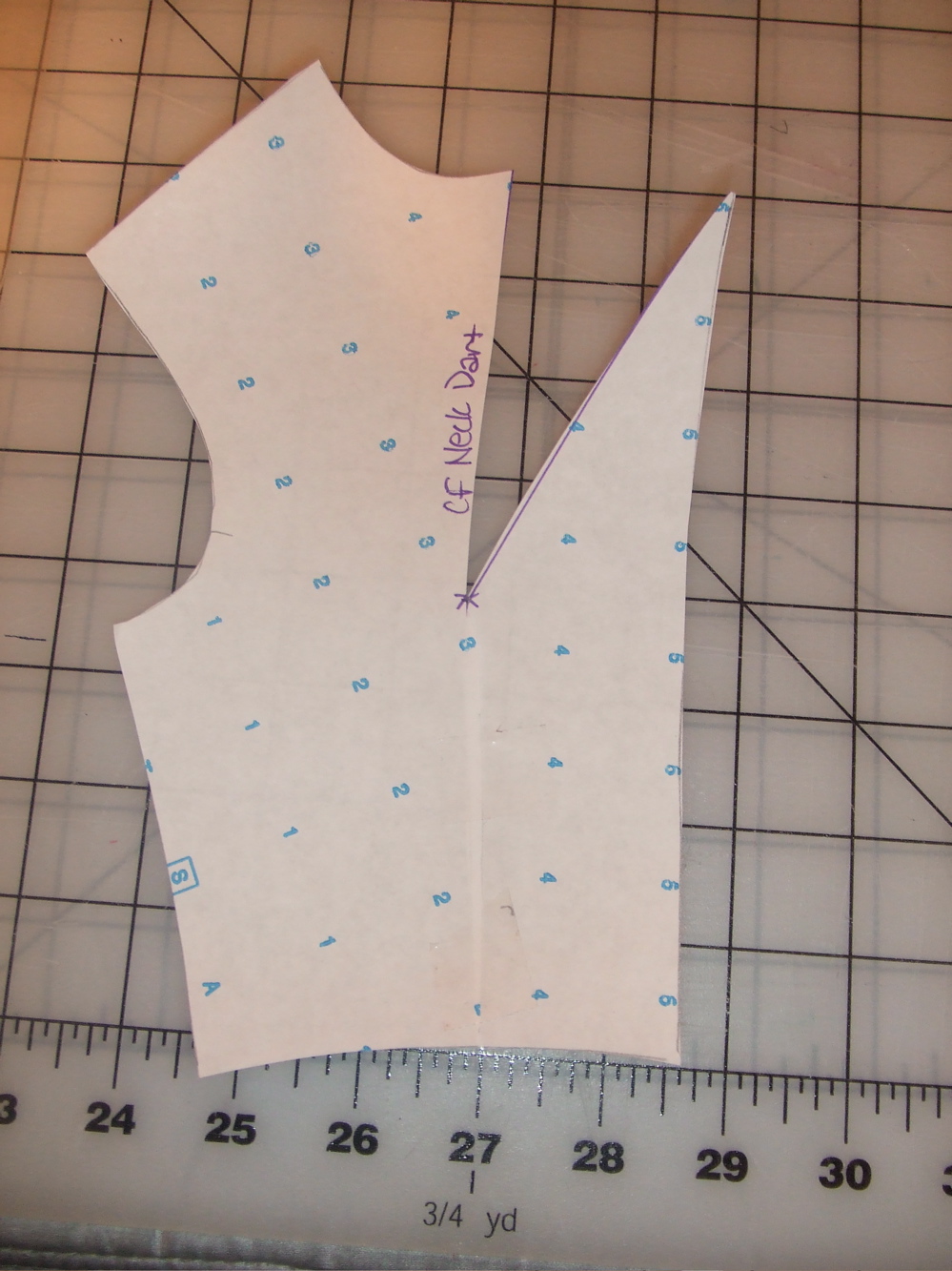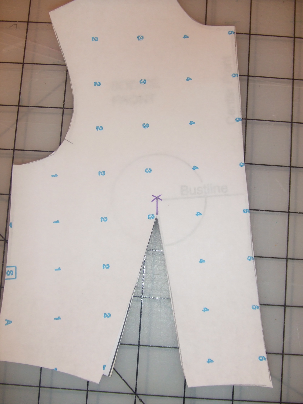 First, I mark my bust point by putting the pattern paper on my sloper (it’s the purple asterisk)