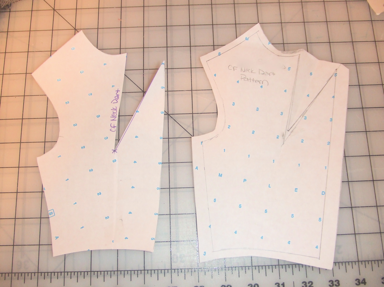 After that, we worked on adding seam allowances to make this an actual pattern. 1/2 inch for straight lines and 1/4 inch for curves (on a full scale we would add 1 inch for straight lines and 1/2 inch for curves).