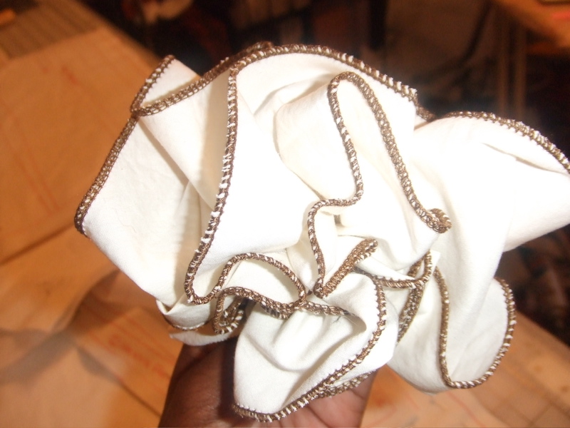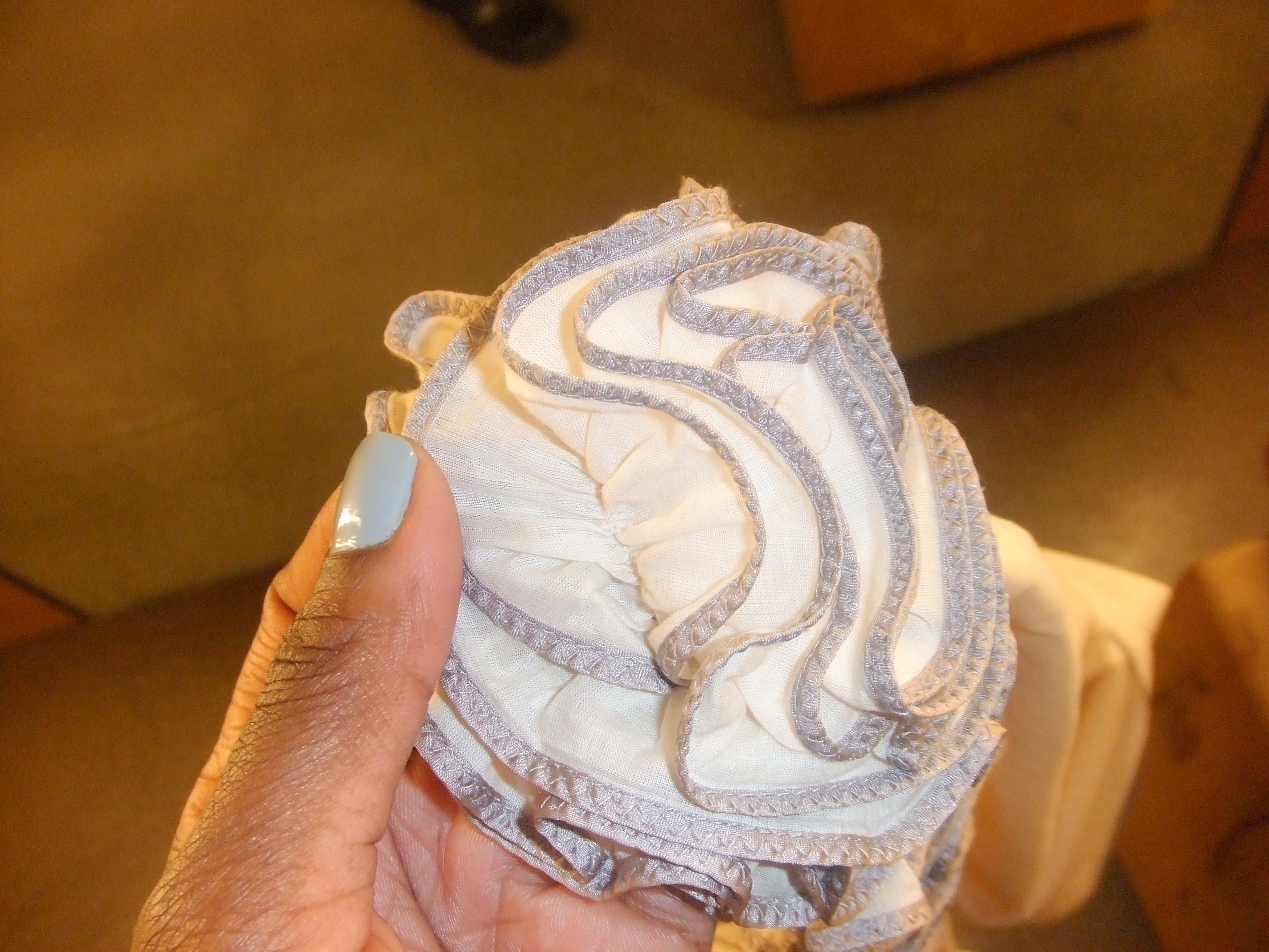 Rather than just ruffle them and sew them down, they are ruffled a little, then stitched down the midde in a circular / rosette pattern. Really pretty. I’m going to try and approximate the contrast trim with a serger rolled hem. It would probably work best with Wooly Nylon. But, Wooly Nylon and I don’t talk.