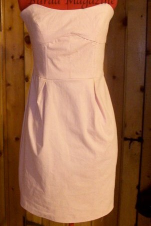 I wore the Creamsicle dress from the March 2010 Burda tonight for my birthday dinner. I’m happy to report that it didn’t fall all night. But, that is was so cold I wore a sweater most of the time! The dress is made from an unlined stretch, cream and orange striped denim. I should have underlined the bodice because as you can see, it’s collapsing above the boning and below my bust.