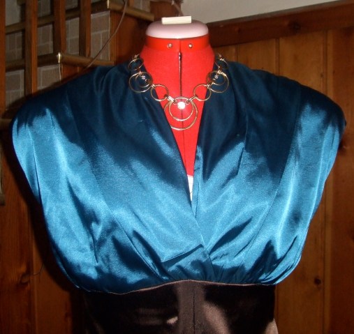I definitely think the shoulder pads improved the look-the era that dress is from was all about the strong shoulder. You can imagine Rita Hayworth in that gown. I think the shoes work well with the feel of the gown, though in a perfect world you’d find some vintage platforms in just the right shade of brown hammered satin!