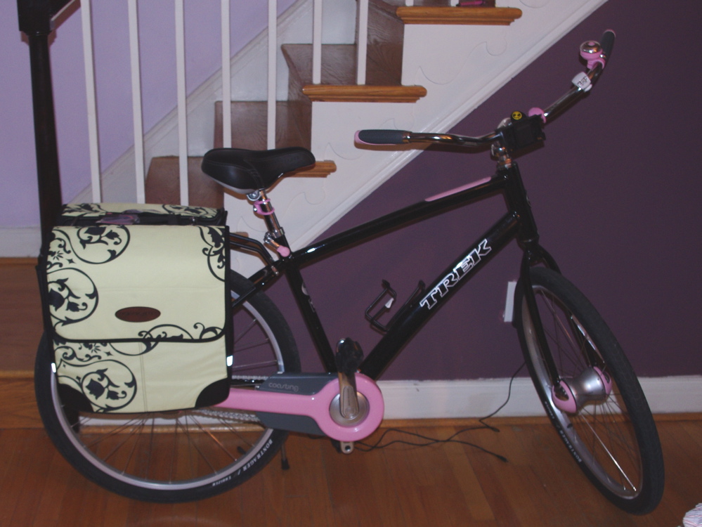 And, my Axiom shopper pannier bags came. I love a bargain. These were on clearance for 50% off! Next time, I’ll try and make them with the directions that Marie-Christine sent. But, it would have cost me more in fabric this time than the completed bag. And, this way — I’ll have a pattern 😀 I’ve now ridden downtwon four times. Today was the first time I did it by myself (I have a friend who rides daily and have been going with her). Now, I just need to work on riding back home (it’s mostly uphill).