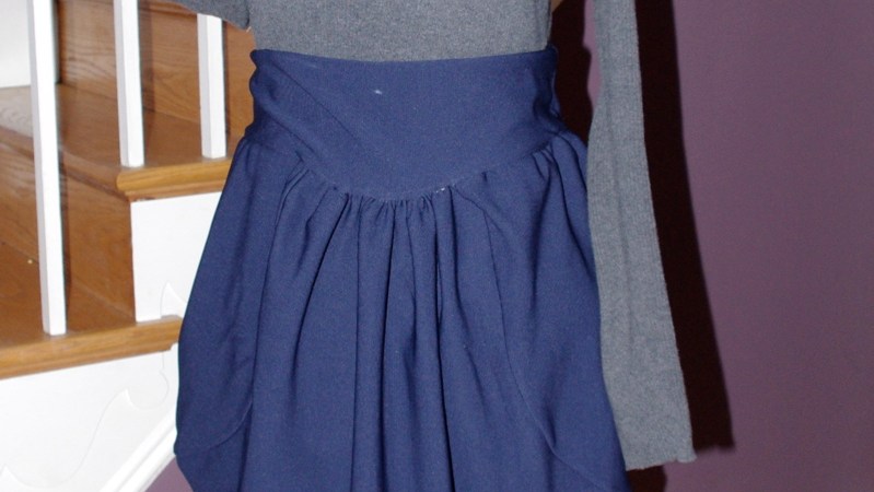 I shortened the skirt by about six inches since it fell way below the knee and lenghthened the side gathers so they draped more. I like that it’s not formfitting (knits and m thighs are not a good look). I was also able to omit the elastic in the waistband. The knit was sturdy enough to stay up without it.