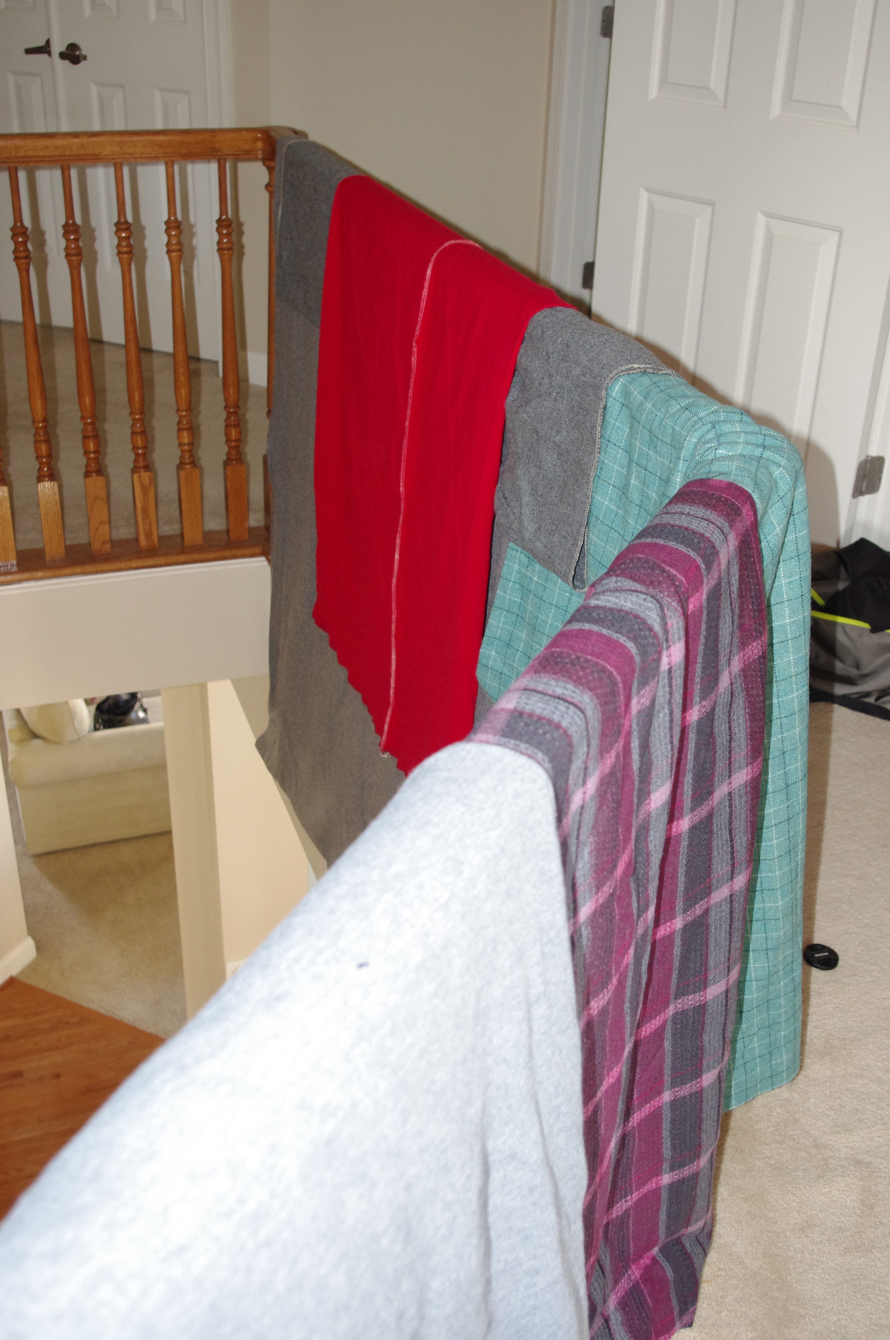 15 minutes in her dryer my wools were warm but dry. I let them hang over her balcony to cool. Mission accomplished. See, Pam totally saved my $100.