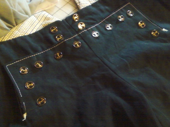 I just need to sew on these 8 million buttons and maybe switch out my topstitching from cream to gold (to match the anchors and eyelets in the back).