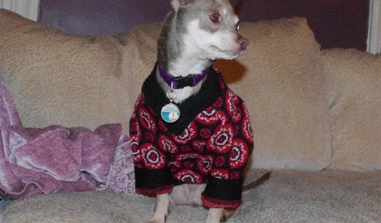 Third, I went back to the original length. I shortened the pattern the first time, but decided it was a little too short for him (again, he’s longer than a typical Chihuahua). I do think it’s a little big at the neckline still, so I’ll adjust for that next time.