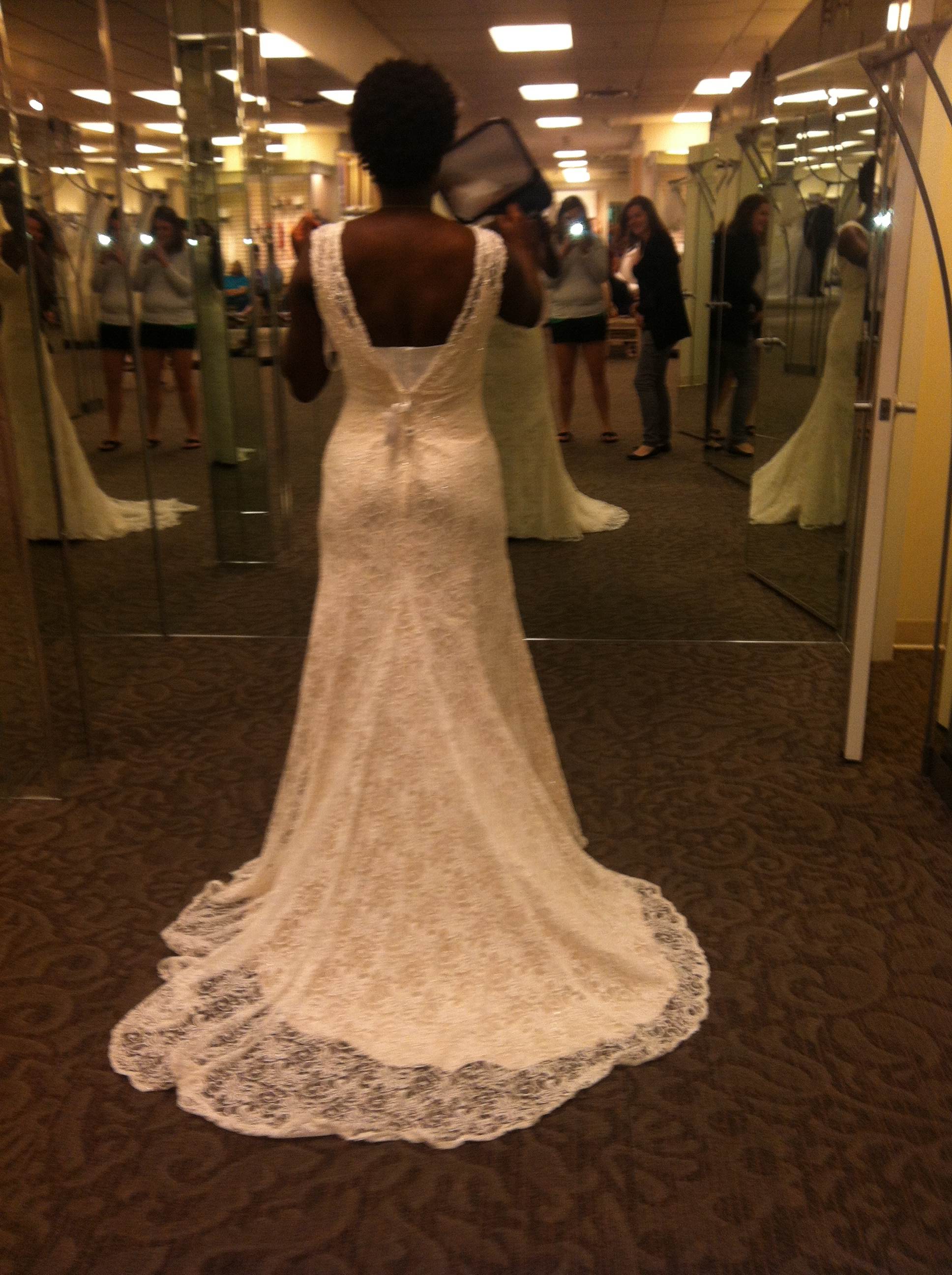 My dress had a crazy low back. I was partly sold on this dress because I thought it made my butt look pretty good and me skinny. Well, slimmer. If you order in the store it can take 8 – 12 weeks. Online, two days.