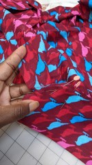 The bodice is M6891 as I think the open neckline works best for me. I switched out the pattern skirt for something without bias and went with M6696. For my clothes, I personally don’t like when a directional print arches like a rainbow or frown on the skirt. That’s just me! So, to have a skirt where the birds more or less are straight, I chose a non bias skirt. I did not do this, but if you do mix the two patterns, the front skirt needs about 2″ added in width. The back didn’t need any additional width added to match the back bodice.
