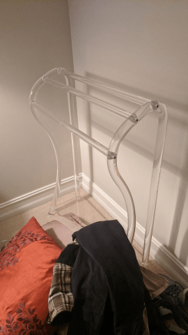 Your quilt is gorgeous, and is such an accomplishment–I know how loaded emotionally such projects can be, and while they’re hard to start, there is a deep soul-filling at their completion. If you save searches for “quilt rack” and “blanket rack” on ebay, I think what you’re looking for will find you, and you might also consider spray-painting a metal quilt rack in a bright coordinating color as an option.