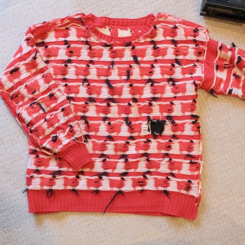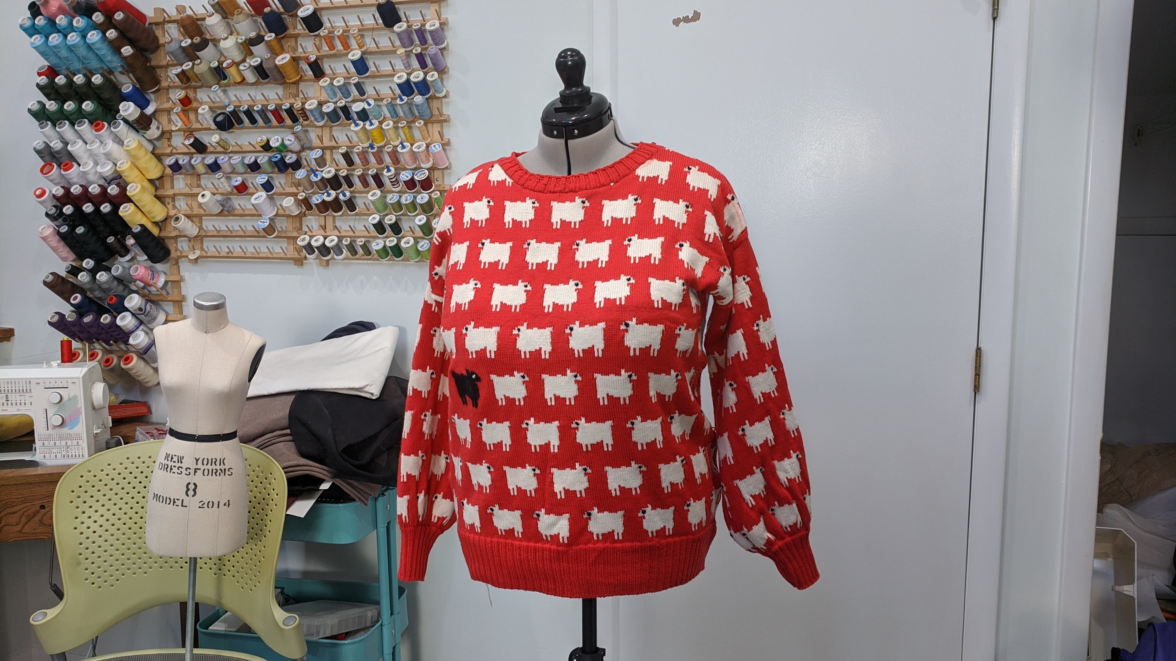 Yarn is “firefighter” from Made in America Yarns (MIAY). MIAY is based out of Philadelphia and comes on a cone, a win win for choosing my fiber. I wish it was a brighter red, in person it’s a more muted color that I’d call watermelon. Cones from MIAY are $25 for a pound vs twice as much other places. It also didn’t have to travel from far, so it got to me around the holidays in two weeks (normally takes a day from Philly). So not counting my time, I made this for around $100. It’s selling from Rowing Blazers at the moment for $300. Which after having made this and done a crazy amount of handwork to get those black eyes, if I had $300 and couldn’t make it for myself and enjoy the making process, I would just buy it, lol.